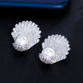 Silver Plated Full Sparkling CZ Cubic Zircon Pave Scallop Shaped Elegant Big Pearl Stud Earrings for Women Wedding